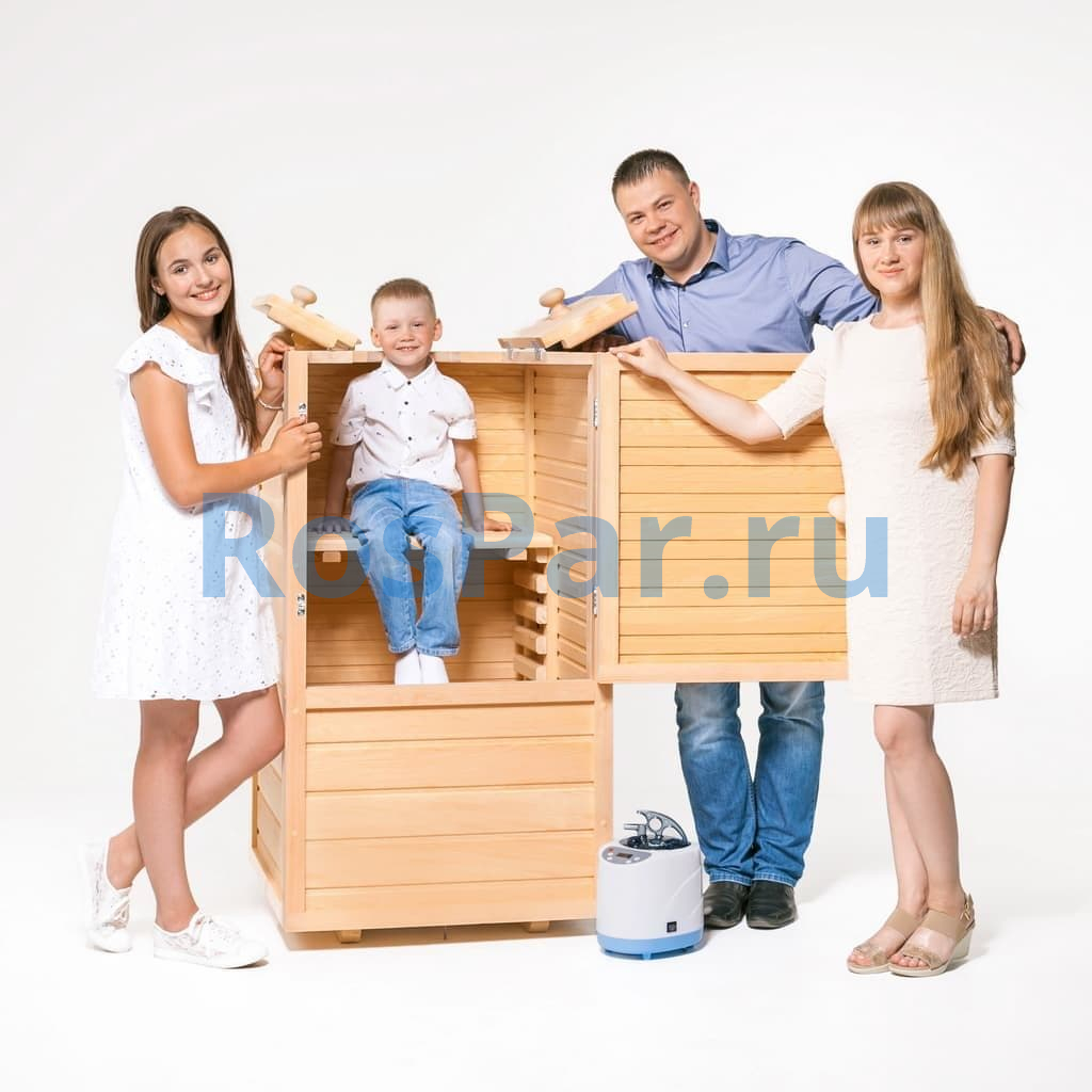 Благодаря квадратной форме внутреннее пространство используется максимально эффективно. Мини-сауна подходит людям любого роста и комплекции. Внутри установлены эргономичные подлокотники для удобства рук и сиденье с регулировкой по высоте (три уровня), что позволяет подобрать оптимальную позу для приятного и полезного отдыха.