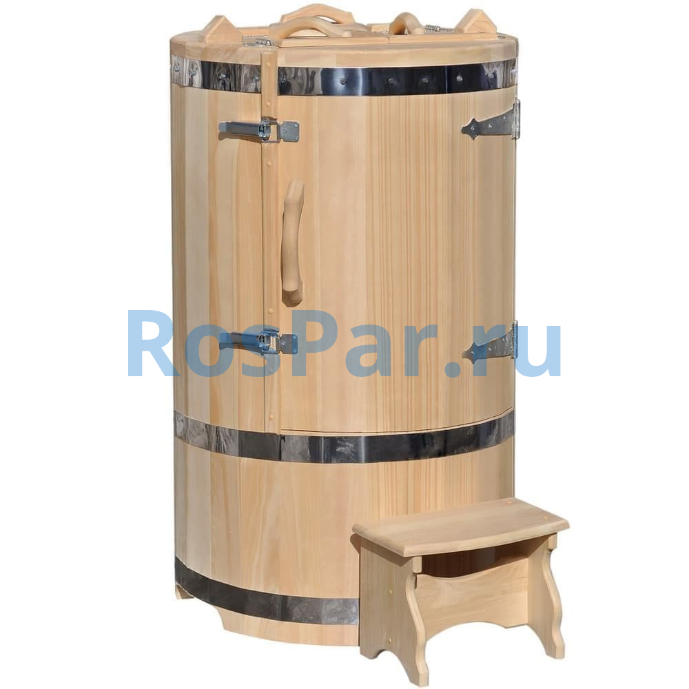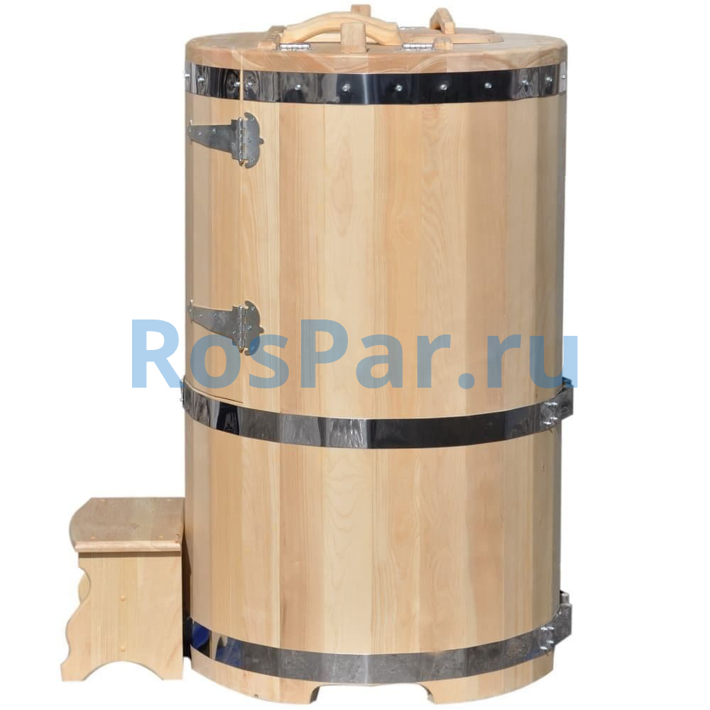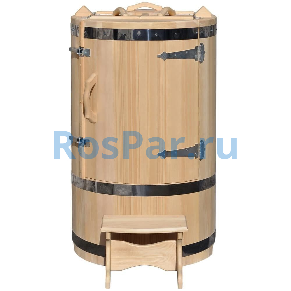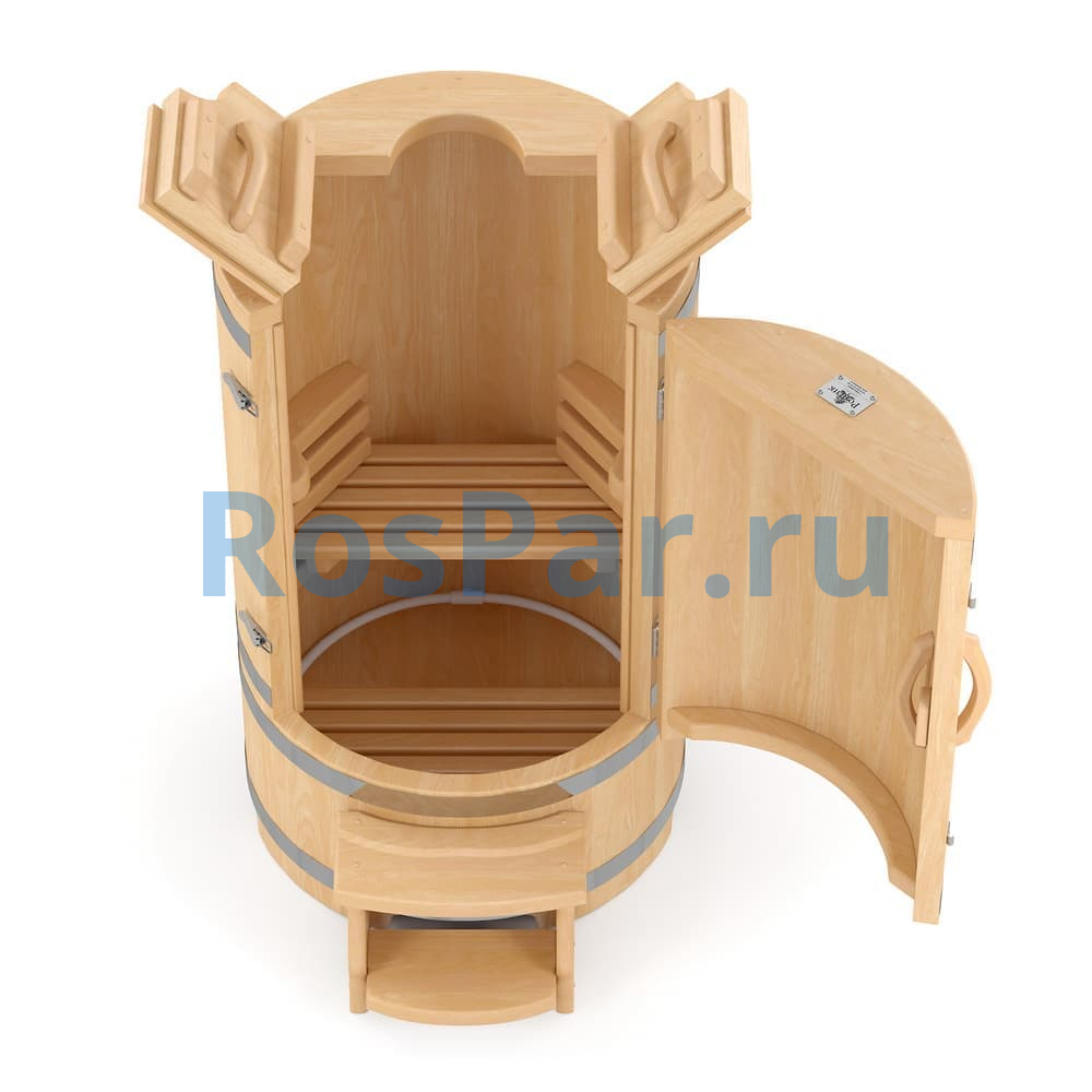 Бочка сохраняет компактные размеры, но внутри просторна и удобна. Сиденье с регулировкой высоты позволяет настроить оптимальное положение для любого пользователя. Встроенные ручки и внутренний засов обеспечивают дополнительную безопасность во время процедур.