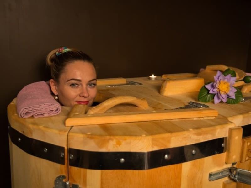 Вариант первый: берем 0,5 л хвои пихты, сосны, кедра, готовим отвар в 0,5 л кипятка морской воды и заливаем в парогенератор, в котором уже налито 2,5 л морской воды, на дно бочки укладываем лапник хвойный, для ног устанавливаем кедровый бочонок на 20 л, в который заливаем воду температурой 50°С до 15 литров и капаем 25 капель эфирных масел пихты, кедра, сосны. Время процедуры начинаем с 8 минут, температура внутри бочки составляет 45°С. После процедуры рекомендуется массаж с эфирным маслом пихты и базовым маслом льна в соотношении 1:10. Курс — до 12 процедур с перерывом продолжительностью 6 недель, затем курс лечения до 12 процедур и перерыв 6 месяцев для лечения в стационаре. Длительность лечения может составлять до двух лет. Наблюдение у ангиохирурга, который позволит подвести итог об эффекте консервативного лечения, обязательно.